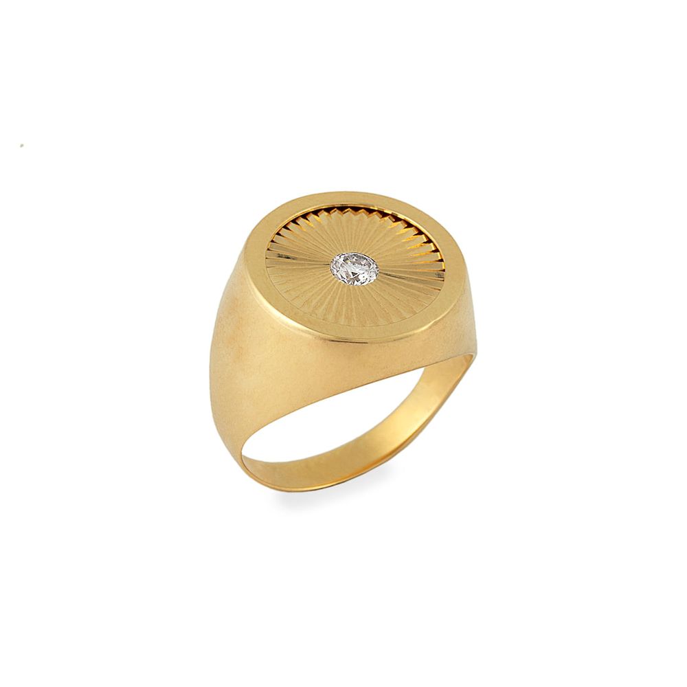 Sua estrutura em ouro 18K oferece resistência e durabilidade, enquanto o acabamento com efeito diamantado confere luminosidade sutil e textura sofisticada à superfície. O ponto central em moissanite proporciona um brilho marcante, com alta refração de luz, evocando a aparência de pedras preciosas clássicas, porém com identidade própria.