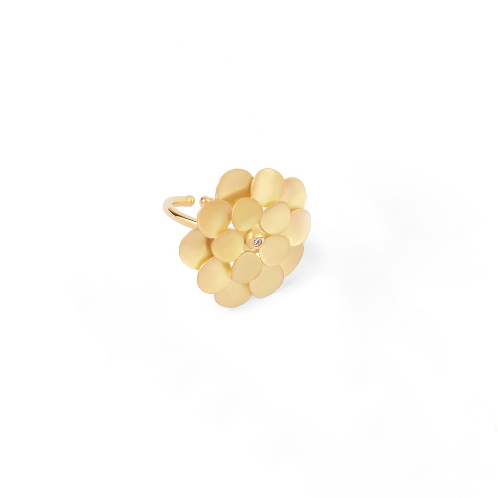 A construção da peça evidencia precisão joalheira e proporções cuidadosamente pensadas. Cada disco compõe a flor com harmonia e volume, resultando em um anel que se destaca pela presença estética e pelo refinamento dos materiais. O diamante adiciona um ponto de brilho sutil e elegante, reforçando o caráter atemporal da joia.