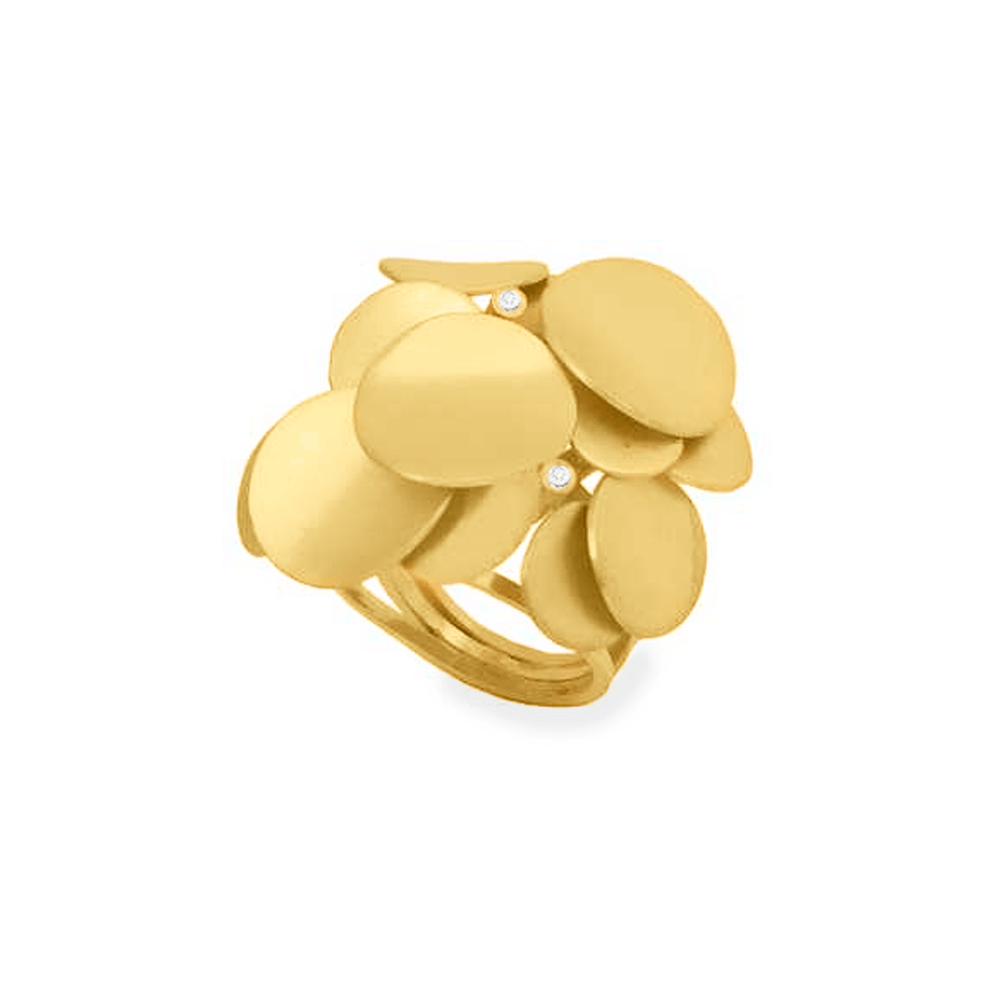 Os dois diamantes naturais, com lapidação criteriosa e total de 0,04 quilates, adicionam pontos de luz sutis e refinados, elevando a peça a um nível de sofisticação discreta. Ideal para quem aprecia joias com personalidade, o anel transita com facilidade entre ocasiões formais e produções do cotidiano, mantendo sempre uma identidade elegante.