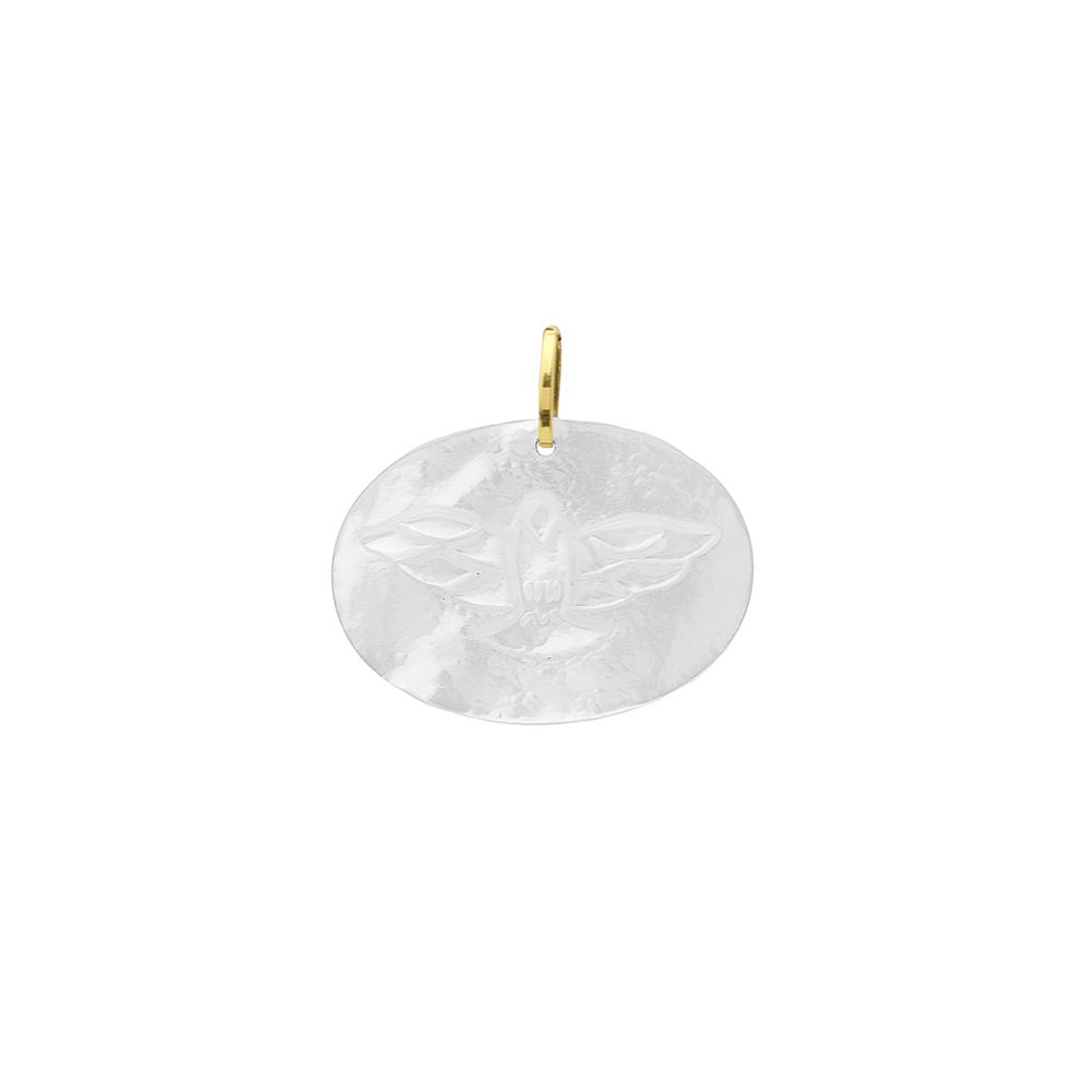 Com acabamento refinado e proporções equilibradas, a peça apresenta 23 mm de altura, 24 mm de largura e 1,6 mm de espessura, com peso aproximado de 2,2 g. Seu formato circular com a aplicação da madrepérola confere brilho suave e natural, enquanto o símbolo central reforça seu caráter religioso e emocional, tornandoo ideal para uso diário ou ocasiões especiais.
