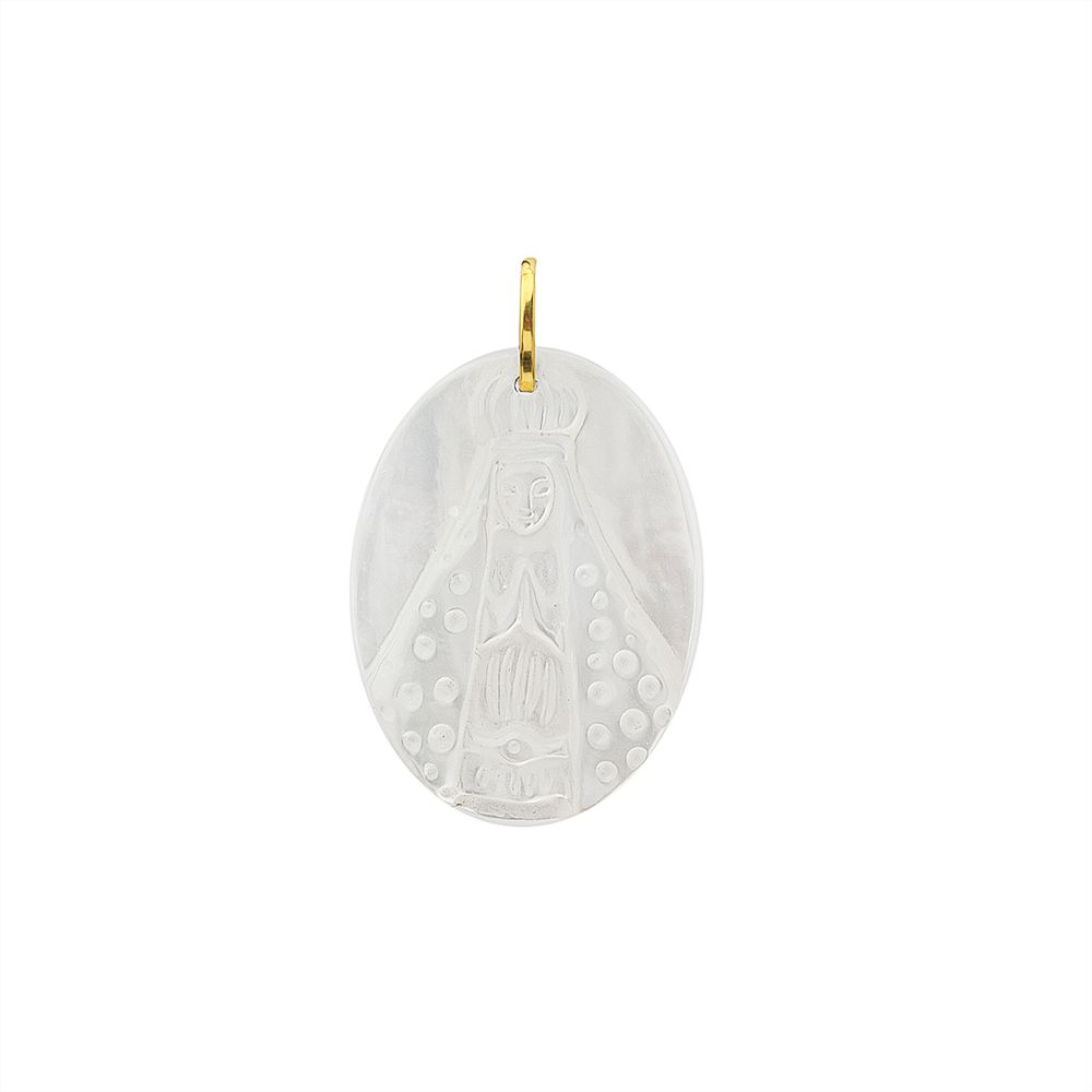 Confeccionado em ouro 18k, o modelo apresenta acabamento refinado e proporções equilibradas, com destaque para a madrepérola natural, que confere luminosidade suave e textura orgânica à peça. A composição entre o ouro e a madrepérola cria uma estética elegante e atemporal, valorizando o significado espiritual do pingente sem excessos, mantendo uma presença discreta e sofisticada.