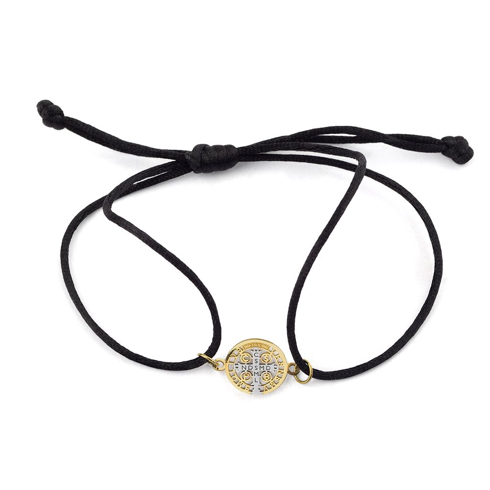 Seu pingente em ouro 18k, com aproximadamente 9 mm de diâmetro e 0,30 mm de espessura, destaca a simbologia clássica de São Bento em acabamento preciso e elegante. O fio de seda confere leveza e conforto ao uso, sem fecho, com ajuste natural ao pulso, proporcionando praticidade e segurança no uso contínuo.