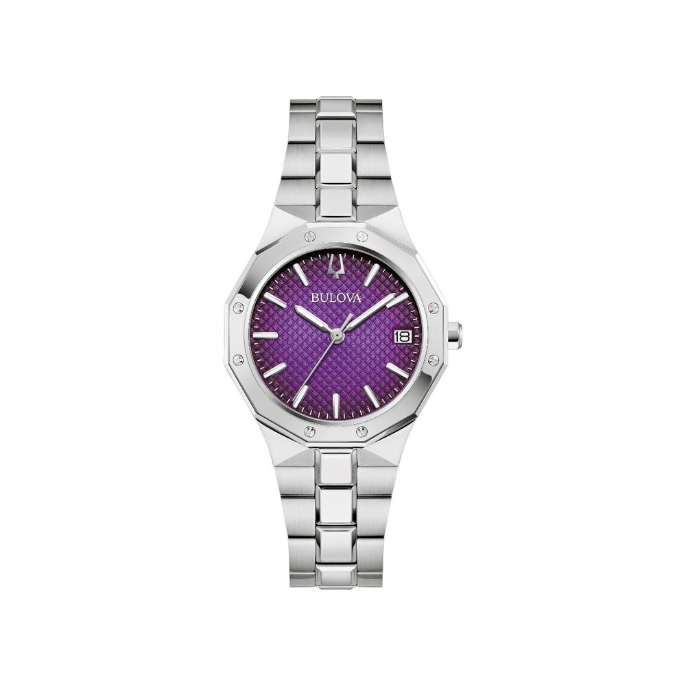 Equipado com o movimento de quartzo Miyota 2115, o 96M168N oferece uma precisão excepcional, com variação de apenas ±20 segundos por mês. Seu mostrador lilás, com padrão texturizado em degradê, é protegido por um vidro de safira com revestimento antirreflexo, garantindo clareza e resistência ao desgaste diário. Os ponteiros prateados luminosos e os marcadores aplicados com Super-LumiNova asseguram legibilidade em diversas condições de iluminação