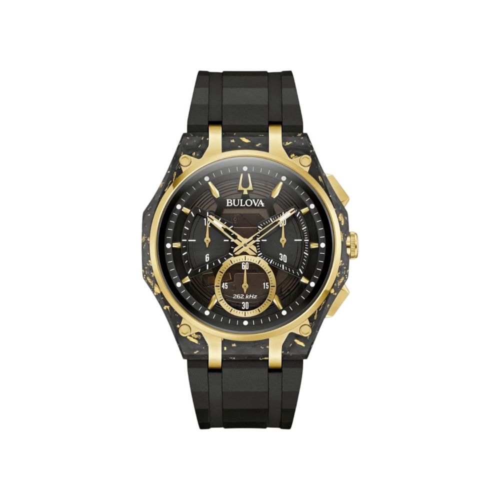 O vidro curvo em cristal de safira antirreflexo protege o mostrador, enquanto a pulseira em borracha HNBR eleva o conforto sem comprometer a presença robusta no pulso. No coração desta peça está o movimento NR20 com tecnologia HPQ CURV, um quartzo de alta precisão curvo de 262 kHz desenvolvido pela Bulova, que proporciona desempenho cronográfico superior e excepcional precisão em relação aos movimentos tradicionais de quartzo.Maior do que um acessório, este relógio representa o auge da engenharia relojoeira moderna: cronógrafo analógico com função de cronometragem progressiva, caixa de 44 mm, resistência à água de 3 ATM e acabamento em preto e dourado que conferem caráter sofisticado e contemporâneo.