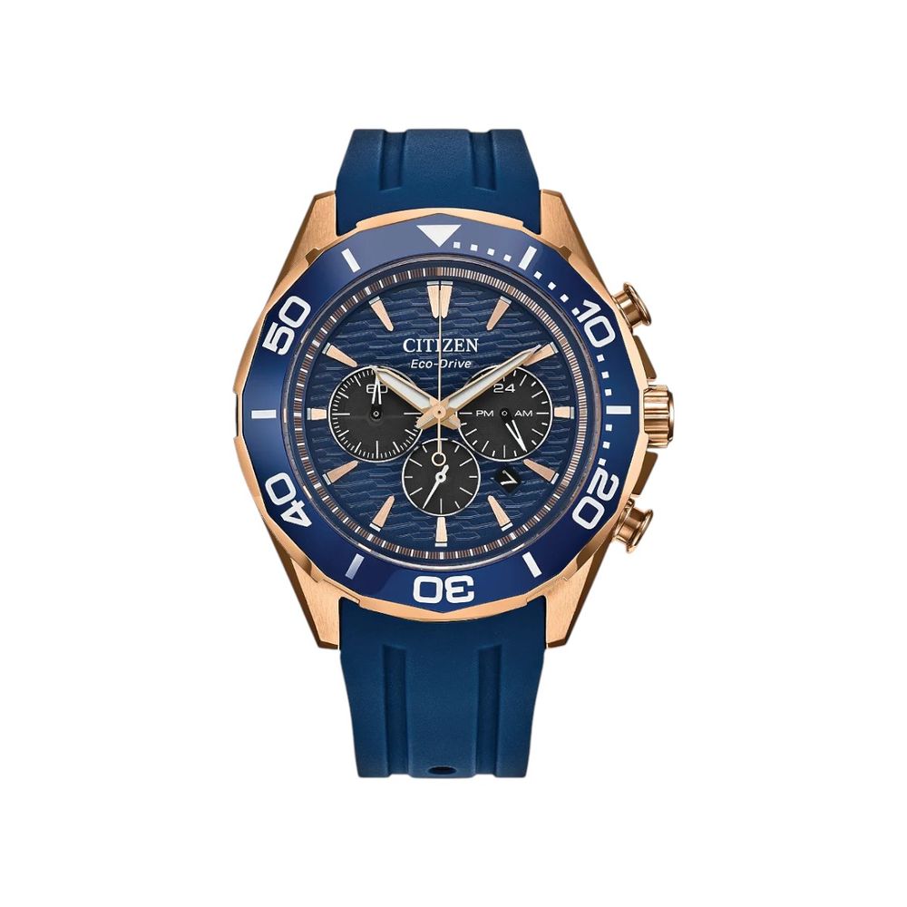 Equipado com movimento EcoDrive de energia solar calibre B612, o relógio utiliza qualquer fonte de luz para funcionamento contínuo, eliminando a necessidade de troca de bateria. Esse sistema oferece precisão confiável e autonomia prolongada, aliado à funcionalidade de cronógrafo, indicador de 24 horas e calendário, que ampliam sua utilidade no dia a dia. O mostrador azul reforça a identidade esportiva do modelo, mantendo excelente legibilidade e equilíbrio visual.