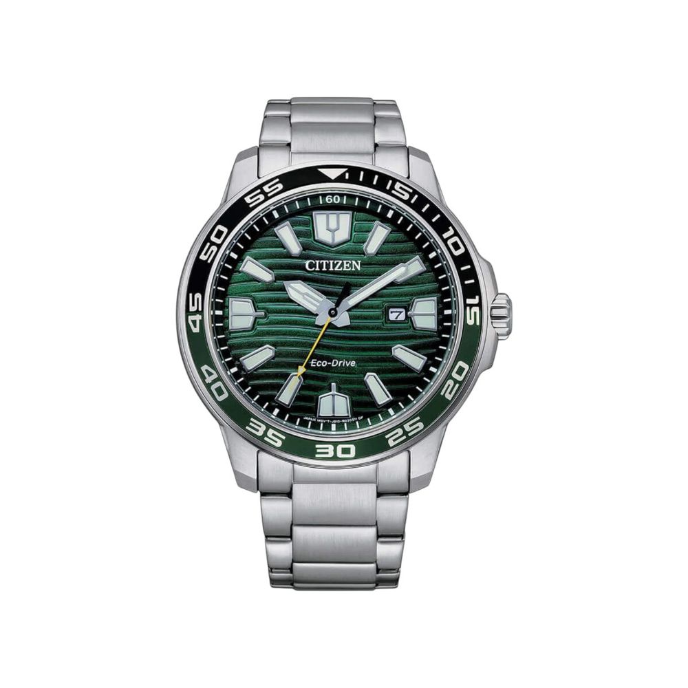 Equipado com movimento EcoDrive de energia solar calibre J810, o relógio utiliza qualquer fonte de luz para funcionamento contínuo, eliminando a necessidade de troca de bateria. Essa tecnologia proporciona precisão confiável e autonomia prolongada, além de reforçar o compromisso da marca com eficiência energética. O mostrador verde acrescenta personalidade ao modelo, enquanto os índices e ponteiros luminosos garantem leitura facilitada em ambientes com pouca iluminação. A função de calendário amplia a praticidade no uso cotidiano.