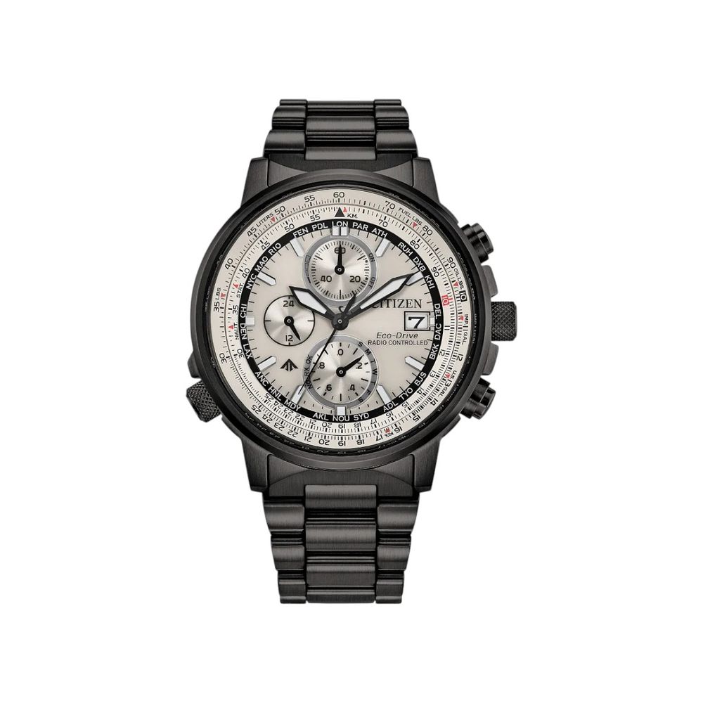 Equipado com movimento EcoDrive de energia solar calibre H800, o relógio converte qualquer fonte de luz em energia, dispensando a necessidade de troca de bateria e garantindo autonomia prolongada. O modelo conta ainda com tecnologia Radio Controlled, permitindo ajuste automático de horário por sinal de rádio em regiões compatíveis, o que assegura precisão avançada. Entre suas funcionalidades estão calendário perpétuo com indicação de mês e dia da semana, cronômetro de até 60 minutos, indicador de 24 horas, indicador de carga e reserva de energia, além de sistema de economia de energia. A presença da régua de conversão reforça sua proposta voltada ao universo aeronáutico.