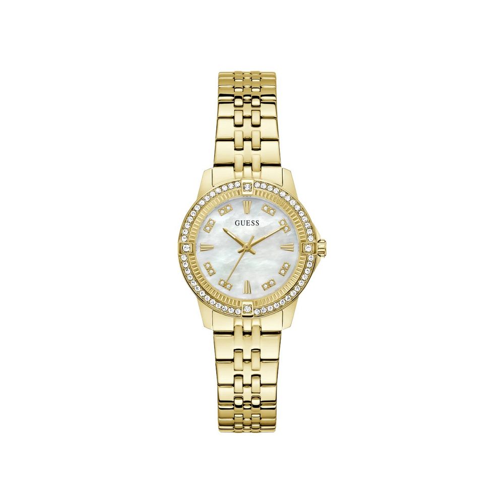 O Relógio Guess Feminino GW1027L2 traduz a elegância contemporânea da Guess, integrando uma linha fashion que valoriza materiais sofisticados e detalhes refinados. Com aplicação de cristais na caixa e um mostrador em madrepérola também adornado por cristais, o modelo apresenta uma composição luminosa e delicada, destacandose pela harmonia entre brilho e textura.