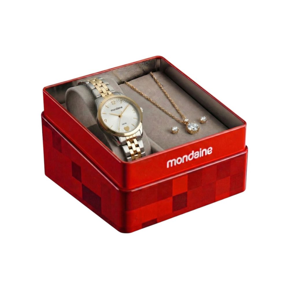 Com resistência à água de até 5 ATM, o modelo permite o uso em situações cotidianas como respingos e contato ocasional com água, ampliando sua funcionalidade. Como diferencial, acompanha um conjunto de colar e brinco em bijuteria, formando uma composição coordenada que agrega valor estético e amplia as possibilidades de uso.