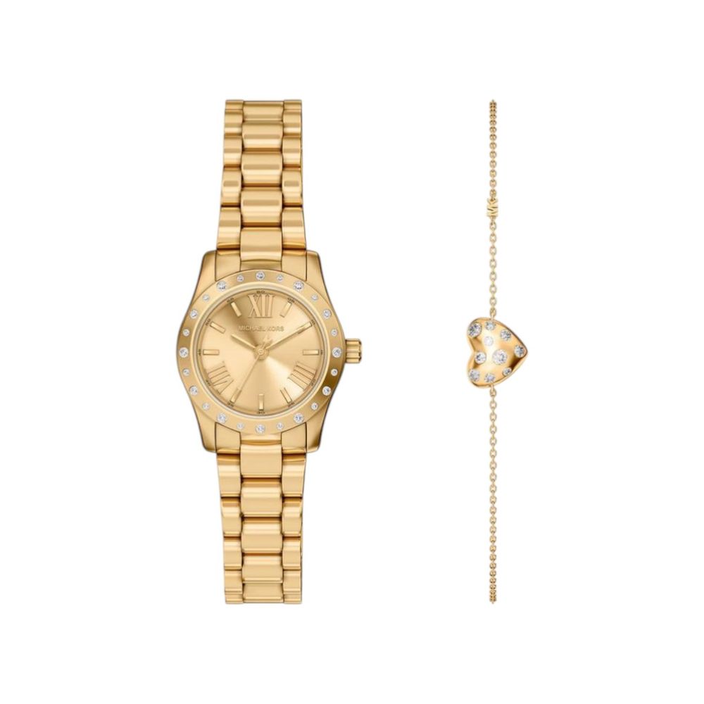 A caixa em aço inoxidável com aplicação de cristais revela um acabamento sofisticado, enquanto a pulseira em aço inoxidável reforça a durabilidade e o conforto no uso contínuo. O mostrador dourado cria uma composição monocromática elegante, valorizando a leitura das horas com clareza e conferindo identidade visual marcante ao modelo. O vidro em cristal mineral atua como proteção contra riscos leves, contribuindo para a preservação da peça.