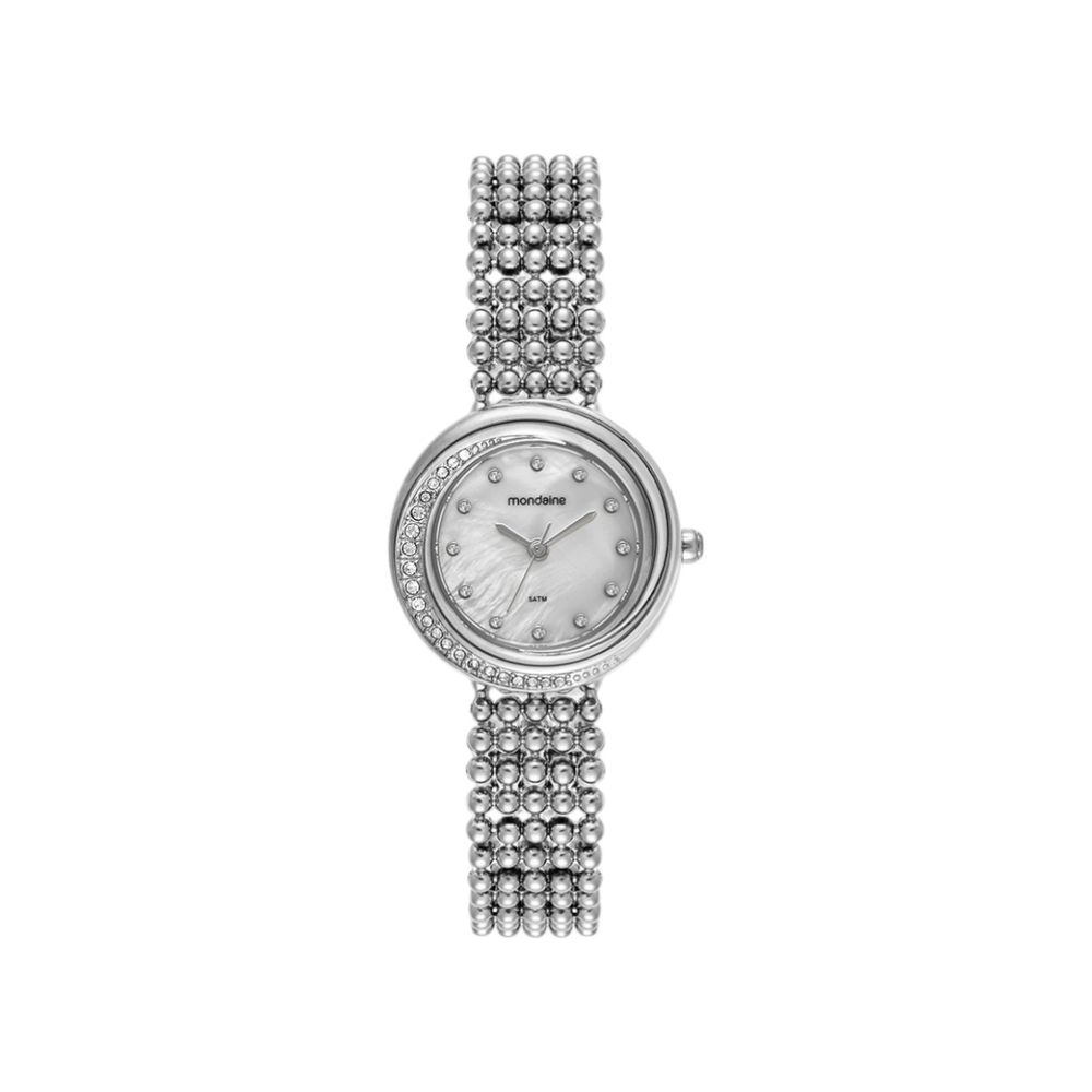 A caixa em aço inoxidável com aplicação de cristais, medindo aproximadamente 30 mm, proporciona um encaixe confortável no pulso, enquanto a pulseira no mesmo material reforça a durabilidade e a harmonia do conjunto. O mostrador em madrepérola acrescenta profundidade visual e sofisticação, enriquecido por cristais que captam a luz de maneira discreta. O vidro em cristal mineral protege a peça, contribuindo para maior resistência a riscos no uso cotidiano.