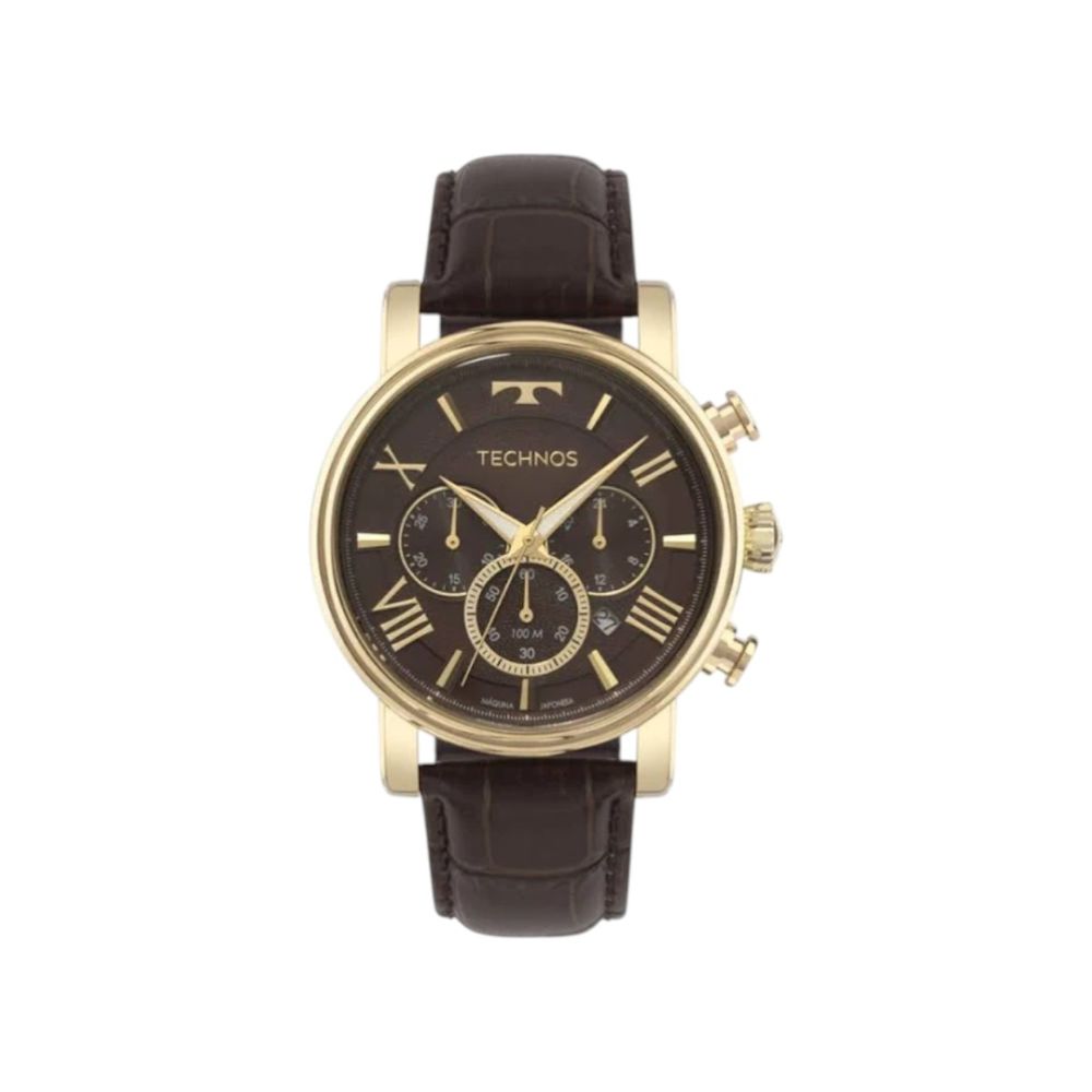 A caixa em aço inoxidável, com aproximadamente 44mm, confere imponência ao relógio, enquanto a pulseira em couro marrom acrescenta conforto e um contraste elegante ao conjunto. O mostrador marrom reforça a identidade visual do modelo, com elementos bem definidos que facilitam a leitura das funções. O vidro em cristal mineral contribui para a resistência no uso diário, protegendo contra riscos e impactos leves.